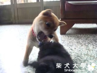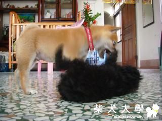 cookie → 小柴 mini → 小貴賓  準備開戰囉!!!  cookie:死mini 我要把你吃掉。。。  mini :別再咬我了。。。  mini:我認輸了。。。我舉四腳投降 cookie:看你以後還敢不敢惹我!! 我可沒虐狗喔...他們自己愛玩的!!!!