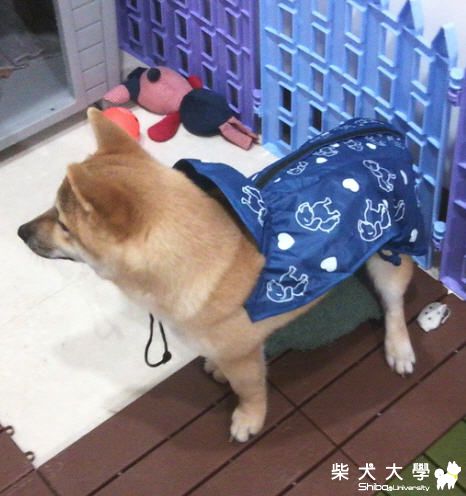 這傢伙,果真第一次穿上雨衣就定格..不敢動了..還得我在家門口半推..推出門去..