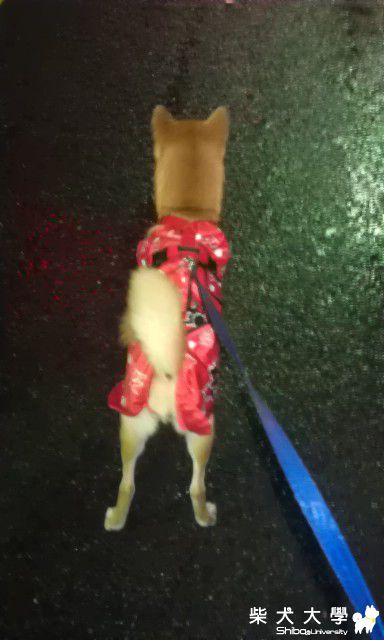 到了公園,一如往常..到處作記號(中途多次可能因為穿雨衣的關係,姿勢橋不定),最後選定位置要便便了..