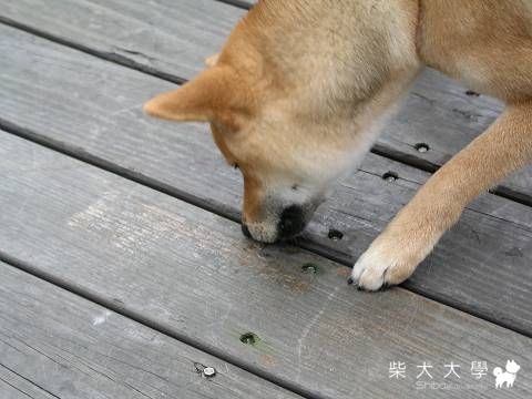 結果是樹葉卡在木地板的縫裡,他一直舔、一直抓想把樹葉弄出來!