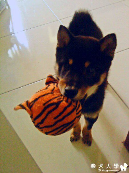 今天上課出門時.... 不卜咬著牠最愛的小老虎到門前... 眼神透露出....陪我玩嘛...:15:  喔!水汪汪的大眼!!雖然黑的看不太清楚...