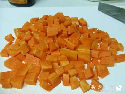 要切碎一點喔!畢竟狗狗們還是肉性動物,要切碎一點跟肉末混在一起才不會被挑出來!