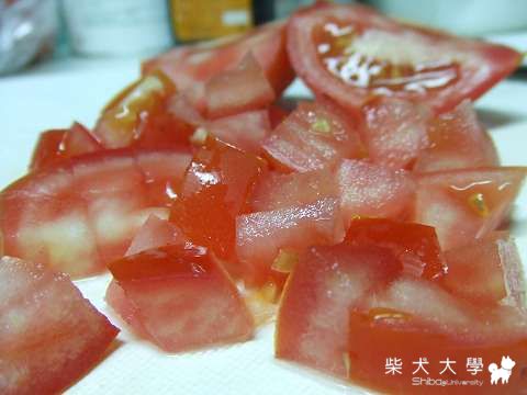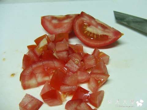 再來是番茄,一樣洗淨、去蒂、切塊