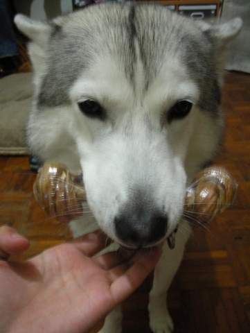 拍完照之後 她就一直咬著 可是外面有一層塑膠膜 他吃不到裡面 於是又還給我 :sam16