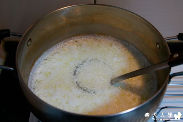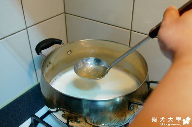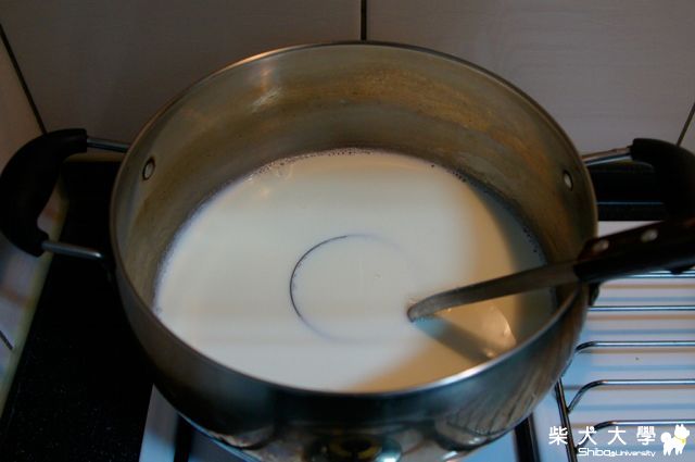 要用中火, 把牛奶慢慢加熱。一定要慢慢來, 太急, 就燒焦囉~~