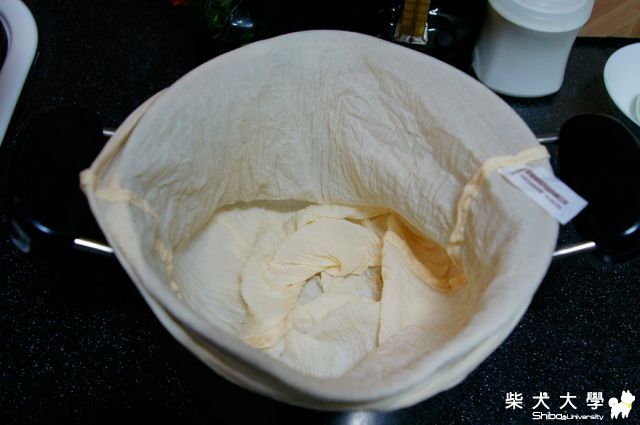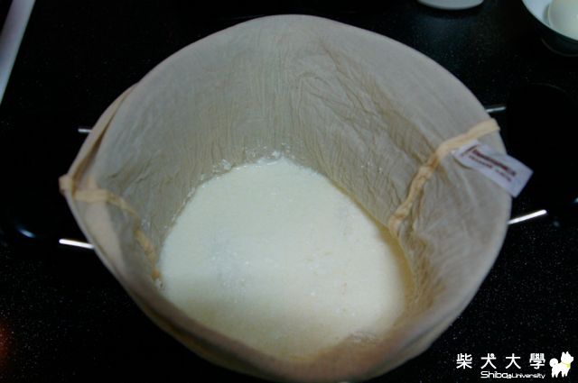 將豆花狀的牛奶倒入, 進行過濾動作。